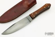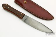 This Coffin Handle Bowie by Paul Cooper features a hand forged antique finished blade with false top edge, .218" blade stock and 1.306" blade depth, full tapered tang construction. The handle has cocobolo scales with brass pins. The tang and blade spine are nicely rounded and the tang has an heirloom fit up with the tang being proud of the scales, fileworked tang. Comes with a brown leather sheath with brass belt stud. New from maker.