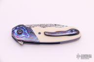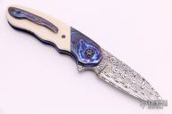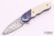 This Kiba flipper from Larevo Knives (Jason Overall) feature a Damasteel blade with notched thumbrest and flipper. The handle has black timascus bolsters, Elforyn scales, anodized titanium liners, black timascus backspacer and tip up clip, zirconium pivot collars, has anodized titanium hardware from Steven Kelly. This knife flips well on caged bearings. Blade is centered when closed and locks up with no blade play, nice detent. Excellent condition. Comes with zippered case and COA dated July 9th, 2018.