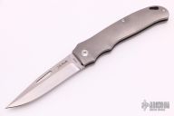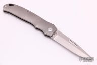This New York Special slipjoint by JE Made features a stonewashed clip point blade with false top edge and thumbhole/nail nick. The handle has a tumble finished titanium frame with faux bolster and jigged covers, tumbled stainless steel spring, lanyard hole at the butt. Has half-stop, flush in all positions. Excellent Condition.