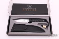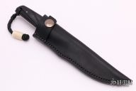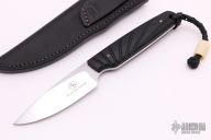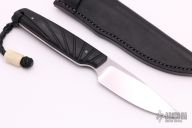 This Bongo by Arno Bernard features a tumbled drop point blade with a notched thumb rest. .115" blade stock and 1.072" blade depth. The handle is comprised of black G-10 scales over full tang construction, kangaroo leather lanyard with giraffe bone bead. Includes a Bovine leather sheath and the original box and papers. Excellent condition.