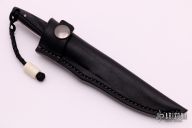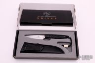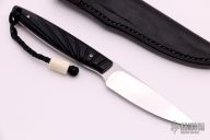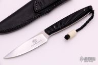 This Bateleur by Arno Bernard features a tumbled drop point blade with a notched thumbrest. .097" blade stock and .784" blade depth. The handle is comprised of black G-10 scales over full tang construction, kangaroo leather lanyard with giraffe bone bead. Includes a Bovine leather sheath and the original box and papers. Excellent condition.