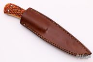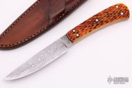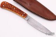 This Hunter by Master Smith Harvey Dean features a cable Damascus blade with .129" blade stock and .873" blade depth, full tapered tang construction with jigged bone scales. Comes with a brown leather sheath. Excellent condition.