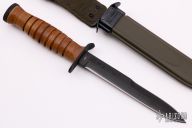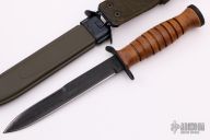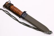 This 65th Anniversary issue of the 1943 M3 is made with the same mark used in 1943, now owned by the original H. Böker in Germany. The blade of SK-5 high-carbon steel at 57-59 Rc. measures 6-11/16" x 7/8" and has the same black coating. The stacked leather handle and the M8A1 metal sheath are true reproductions of the original. Measures 11-5/8" overall and weighs 8.8 oz. Sheath made in Germany, the knife in China. Suggested retail is $144.95. Comes with original box and sheath. Excellent condition.