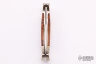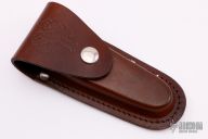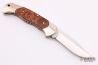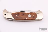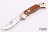This knife by Boker features a clip point blade with nail nick. The handle has a nickel silver frame with wood inlays. Comes with original box, sheath and papers. Excellent condition.