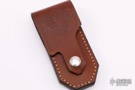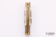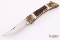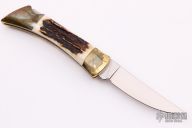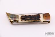 This knife by Boker features a clip point blade with nail nick. The handle has a brass frame with stag inlays. Comes with original box, sheath and papers. Excellent condition.