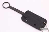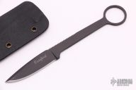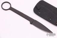 This ringed neck knife from Pat & Wes Crawford features a black spear point blade. The handle is comprised of full tang construction with 1" finger hole in pommel. Includes kydex sheath. Some scuffs in finish, but otherwise good condition.