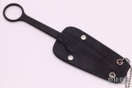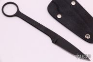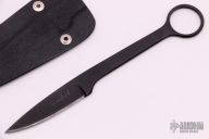 This ringed neck knife from Pat & Wes Crawford features a black drop point blade. The handle is comprised of full tang construction with 1" finger hole in pommel. Includes kydex sheath. Some scuffs in finish, but otherwise good condition. This knife was intended to be a Bird and Trout knife, your pinky finger goes through the hole so you don't have to put the knife down while using it, it can just hang from your little finger.