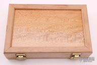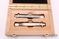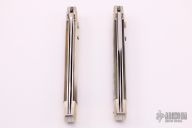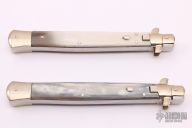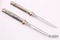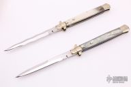 This set of Latama Square Button Autos by Burn Knives features a mirror polished Kris and bayonet style blades with false top edges. The handle has nickel silver bolsters, front and rear, honey horn scales, stainless steel liners and backspacer. Has a nickel silver push button and safety. Nice function. There are few light scratches on these knives, otherwise excellent condition. Both numbered 1 of 5 inside frame and come with a nice Lace wood presentation box.