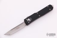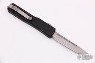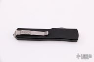 This UTX-70 OTF automatic features a bead blast tanto blade with a standard edge. Stainless steel clip. Serial number 13289 dated 08/2010. Comes with original box, papers, and nylon case with clasp. Excellent condition.