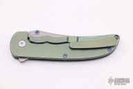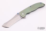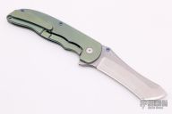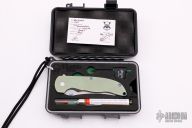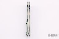 This Norseman (#1744) by John Grimsmo features a stonewashed blade with a single anodized titanium thumb stud, notched thumb ramp and flipper. Anodized finished titanium frame with anodized titanium screws. Has a custom Black Timascus clip with hidden screws, comes with original clip and screws. Very smooth action that requires no wrist movement. Nice detent, lockup and blade seating. Rides on ceramic bearings. Knife is in excellent condition, shows no signs of use or carry. Comes with original packaging, custom hard case, Nano-Oil, tool, and COA dated Dec 11, 2018