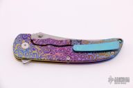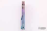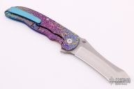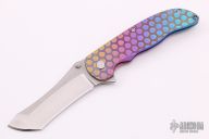 This Norseman (#2377) by John Grimsmo features a stonewashed blade with a single anodized titanium thumb stud, notched thumb ramp and flipper. Anodized titanium frame with a honeycomb pattern front scale and titanium screws. Very smooth action that requires no wrist movement. Nice detent, lockup and blade seating. Rides on ceramic bearings. Knife is in excellent condition, shows no signs of use or carry.