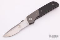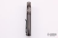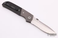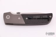 This Terzuola D/A side opening automatic by Microtech features a satin finished blade, bead blasted titanium bolsters, and carbon fiber scales, stainless liners, black coated titanium clip. Leaf spring bolster release. Dated 03/2004 and S/N 0690. Excellent condition. Hard to find. Comes with a black nylon belt sheath.