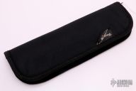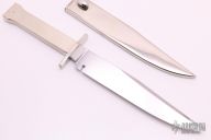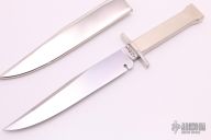 This bowie by Alex Daniels features a hand rub satin finished clip point blade with sharpened top edge, .229" blade stock and 1.322" blade depth, frame/mortise tang construction. The handle has a nickel silver guard and handle. Comes with a nickel silver scabbard and zippered case. Has a few light scratches, otherwise excellent condition.