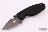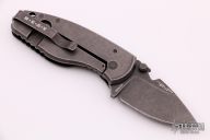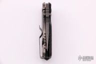 This HEAT/ F Plain Edge Framelock Folder has an acid etched drop point blade with dual thumb studs, bottle opener, and a notched thumbrest. Handle is black G10 and gunmetal titanium, with a matching stainless steel tip up clip and removable glass breaker, lanyard hole. Excellent condition.