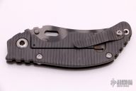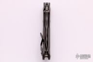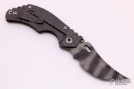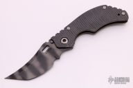 This KRT by Strider Knives features a tiger stripe upswept blade with thumbhole and notched thumbrest. The handle has a flame finished titanium frame with a matching titanium tip up clip. Nice detent, lockup and blade seating. Has some scuffs and scratches, otherwise excellent condition.