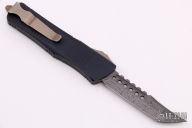 This Troodon by Microtech Knives features a Damascus Hellhound blade. The handle has a black aluminum frame with tip down bronzed stainless steel clip and hardware. Comes with original box and papers. Dated 6/2019. Excellent condition.