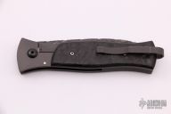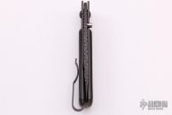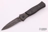 This linerlock by John Kubasek features an acid etched and heavy stonewashed spear point blade with fileworked spine and single thumb stud with opal inset. The handle has carbon fiber scales, bead blasted titanium liners/frame, black canvas micarta backspacer, tip up bead blasted titanium clip. Nice blade seating, detent and lock up. Has a couple scuffs, otherwise excellent condition.