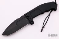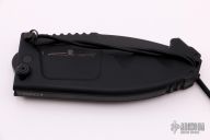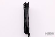 This RAO II Axis Lock Folder has a matte black finished N690 stainless steel spear point/ tanto blade (stamped CK0463F on A-side) with notched thumb rest and multiple grind planes. This knife features a removable threaded pin that prevents deploying the blade when stored. Handle is black aluminum with lanyard and glass breaker.  Excellent Condition.