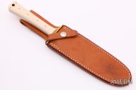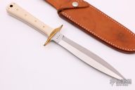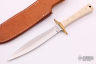 This dagger from Enedino De Leon features a satin finished double edge blade with .184" blade stock and 1.102" blade depth, full tang construction. The handle is comprised of a brass guard and ivory paper micarta scales with brass pins and lanyard tube over red liners and full tang construction. Includes a brown leather sheath with belt loop. Excellent condition.