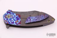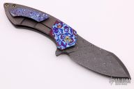 This Argonaut CMF Metalworks features a Damascus blade with flipper. The handle has a tumbled titanium frame with mokuti scale on one side and mokume bolster on the other, tip up mokuti clip with hidden screws, anodized titanium hardware. Rides on bearings, nice detent, lockup and blade seating. Comes with a zippered case. Excellent condition. This is one of the first 20 knives that he made.