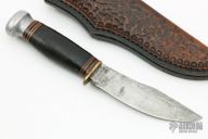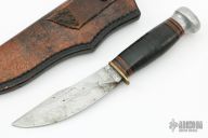 This knife by Marbles is believed to have been made in 1940, it features a clip point blade with notched thumbrest, .177" blade stock, 1.148" blade depth, hidden tang construction. The handle has a brass guard, stacked leather grip, aluminum pommel, black/brass/red spacers. Includes a hand tooled brown leather sheath. Has patina and scratches, has been used and sharpened, otherwise fair condition for its age.
