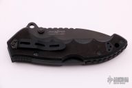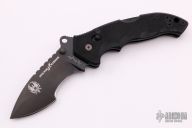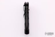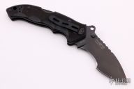 This Specwog Warrior by Fox Knives features a black recurved blade with a notched thumbrest and dual thumb studs. The handle features a black G10 handle over black steel liners and a matching tip down carry pocket clip.