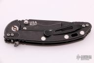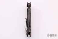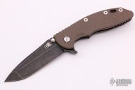 This XM-18 by Rick Hinderer features a black stonewash finished spanto blade with notched thumbrest and flipper. The handle has a brown G-10 front scale, black stonewash finished titanium frame, black  titanium barrel spacers, and a tip up or down reversible working finished titanium clip and filler tab, lanyard hole at the butt. Excellent condition.