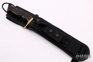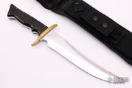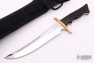 This RARE Model 5 by Walter Brend features a double hollow ground blade with a mirror finish and sawteeth on the spine as well as a sharpened top edge, .279" blade stock and 1.860" blade depth, full tang construction. The handle has a brass double guard, and black linen micarta scales with brass pins and lanyard hole. Comes with a black nylon sheath. This knife is beautiful and sports the "Walterboro SC" logo. Has come scratches from use, has been sharpened, otherwise good condition. Was made in 1980's.