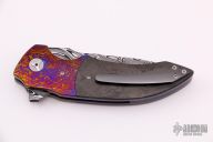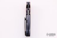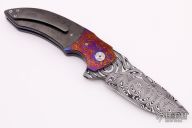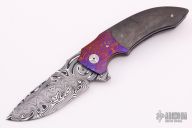 This M44 flipper by Andre Van Heerden features a Grosse Rosen Damasteel blade with notched thumbrest and flipper. Includes IKBS (Ikoma-Korth Bearing System) for fast and smooth flipper opening that requires no wrist action. The handle has timascus bolsters, marble carbon fiber scales, anodized titanium liners, carbon fiber backspacer, and a tip up zirconium clip. Nice blade seating, detent, and lockup. Excellent condition. Comes with a velcro case and COA.