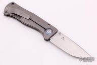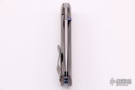 This Small Epicenter by Todd Rexford features a hand rub satin finished spear point blade with false top edge, notched thumbrest and an anodized titanium thumbstud. The handle has a bead blasted titanium frame with a matching tip up clip, anodized titanium barrel spacers, lanyard hole. The handle has been engraved by "DCL 11". Nice detent, lockup and blade seating. Comes with a Velcro case. Has some light scuffs and scratches, otherwise excellent condition.