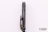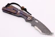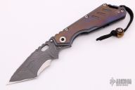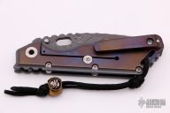 This Mick Strider custom XL framelock folder features a San Mai Damascus blade with dragon spine, notched thumbrest and thumbhole. The handle has an anodized and orange peel finished titanium frame with a machined titanium clip, tip up carry. Jimping on blade spine. Includes Hinderer "Lock Bar Stabilizer" for maximum reverse lock retention. Nice lockup, detent, and blade seating. Excellent work. Signed on underside of tang. Comes with zippered case. Excellent condition. Comes with Starlingear bead.
