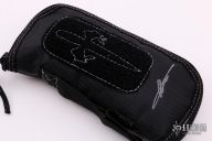 This custom Combat Troodon by Sean and Anthony Marfione features a Vegas Forge Herringbone Damascus Hellhound Tanto blade with notched thumbrest. The handle is hand sculpted black aluminum and carbon fiber with ringed DLC and anodized titanium hardware and a black stainless steel pocket clip. The clip is marked "A. Marfione" and "S. Marfione" and dated 01/2017, and dagger logo is on the clip. Comes with original box, nylon zippered case and papers. Excellent condition. #005