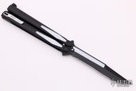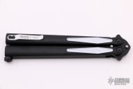 This Tachyon III balisong by Marfione Custom Knives has a black/white clip point fully serrated blade with false top edge. The handles are black/white titanium with spring latch and white tip up pocket clip, black hardware. Includes original box and papers. Rides on bearings, no blade play, very smooth. S/N 049. Excellent condition.