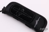 This Custom Combat Troodon by Marfione Custom Knives features a mirror polished Warhound blade with fullers and notched thumbrest. The handle is black aluminum and carbon fiber frame with ringed copper hardware and black stainless steel pocket clip. The clip is marked "A. Marfione" and "S. Marfione" and dated 04/2018, S/N 005 and dagger logo is on the clip. Comes with original box, nylon zippered case and papers. Excellent condition.