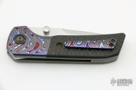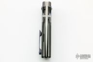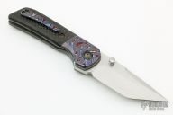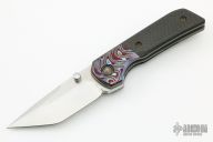 This Chariot linerlock by Sam Johnston features a hand rub satin finished blade with dual thumbstuds. The handle has zircuti bolsters, carbon fiber scales, bead blasted titanium liners, zirconium pivot collars, floating zircuti backspacer and tip up clip. Rides on bearings, nice detent, lockup and blade seating. Excellent condition. Comes with a zippered case.