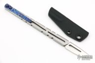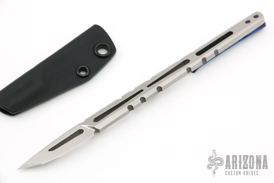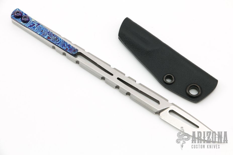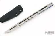This Hurricane Razor from Amsler Knives features CPM 154 handle/blade. This unique piece has a removable, discreet, timascus pocket clip. Screws and clip are titanium. Sharpened portion fits securely into a kydex sheath. Knife can be carried in a shirt pocket because of it's small/discreet nature. Excellent condition.