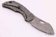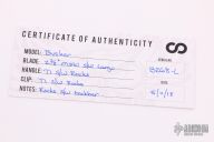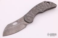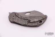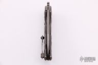 This Busker Largo (B268-L), by Olamic Cutlery, features a tumble finished drop point blade with swedge thumb hole and front flipper. The handle is comprised of a tumbled and carved titanium frame with matching tip up clip over a floating carved titanium backspacer. Lanyard hole in pommel. Includes original padded case and makers card dated 5-11-18. Excellent condition.