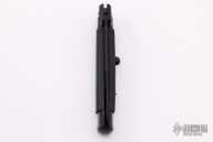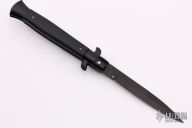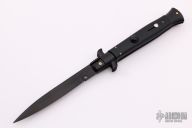 This Swivel Bolster Auto has a black stainless steel spear point blade. The handle is composed of a black steel front and rear bolsters, frame and liners all complemented by non-skid rubber scales. Excellent Condition.