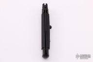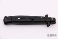 This Swivel Bolster Auto has a black stainless steel spear point blade. The handle is composed of a black steel front and rear bolsters, frame and liners all complemented by non-skid rubber scales. Excellent Condition.