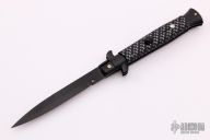 This Swivel Bolster Auto has a black stainless steel spear point blade. The handle is composed of a black steel front and rear bolsters, frame and liners all complemented by carbon fiber pattern non-skid rubber scales. Excellent Condition.