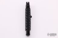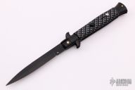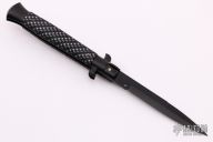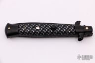 This Swivel Bolster Auto has a black stainless steel spear point blade. The handle is composed of a black steel front and rear bolsters, frame and liners all complemented by carbon fiber pattern non-skid rubber scales. Excellent Condition.