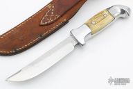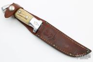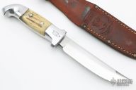 This Sticker by Rudy Ruana features a satin finished blade with false top edge, .172" blade stock and .939" blade depth, hidden tang construction. The handle is cast from aluminum with elk inserts, guard has "M" stamp which signifies it was made by Rudy Ruana. Comes with brown leather sheath and zippered case. Has some scratches, otherwise good condition for its age.