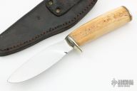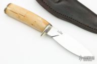 This Knife by Irvin Campbell features a mirror polished drop point blade with visible temper line, .140" blade stock and 1.262" blade depth, hidden tang construction. The handle has a nickel silver guard and butt with walrus ivory handle with black and white spacers. Comes with a brown leather sheath and zippered case. Has some light scratches, otherwise excellent condition.