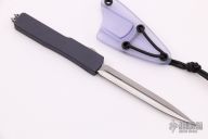 This knife features a 3.5" double edged blade with a stonewashed finish. The handle has a Gun Metal Gray anodized aluminum handle with dual glass breakers. When the knife is closed 1.25" of blade is sticking out of the top. Comes with kydex neck sheath. Dated 06/2014 and S/N 035. Comes with original box and COA. Excellent condition.