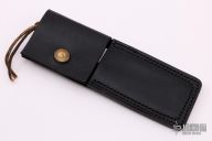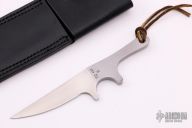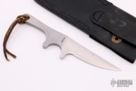 This Tiny Caper by GW Stone features a satin finished blade with .050" blade stock and .723" blade depth, integral construction with lanyard hole. Comes with a black leather sheath. #111 on the blade. Excellent condition.