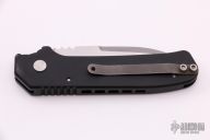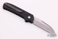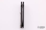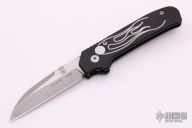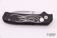 This Wharncliffe coil spring automatic features a bead blast blade with satin finished flats and a notched thumbrest.  The handle features black aluminum handle with flame engraving, bead blasted titanium tip up clip. Numbered 036 on frame. Scuffs and scratches are visible on the blade, handle and pocket clip.