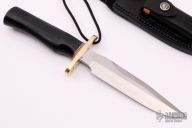 The Model 1 Fighter by Randall Made Knives has a satin finished carbon steel blade with the Sawteeth/No Sawteeth Grind, has sharpened top edge, .210" blade stock and 1.180" blade depth, hidden tang construction. The handle has a Model 18 style brass double guard with holes, black linen micarta single finger grip with red/white/blue spacers. Comes with a black leather sheath and original paper wrapping. New from maker.