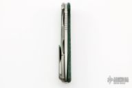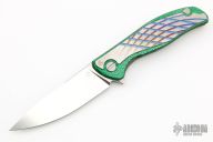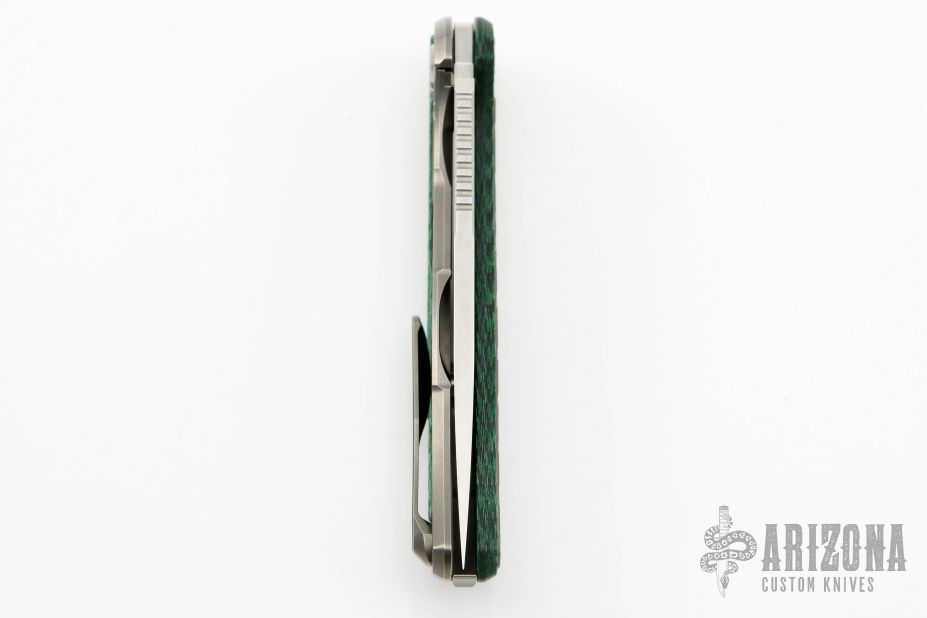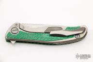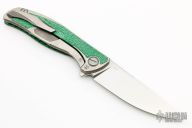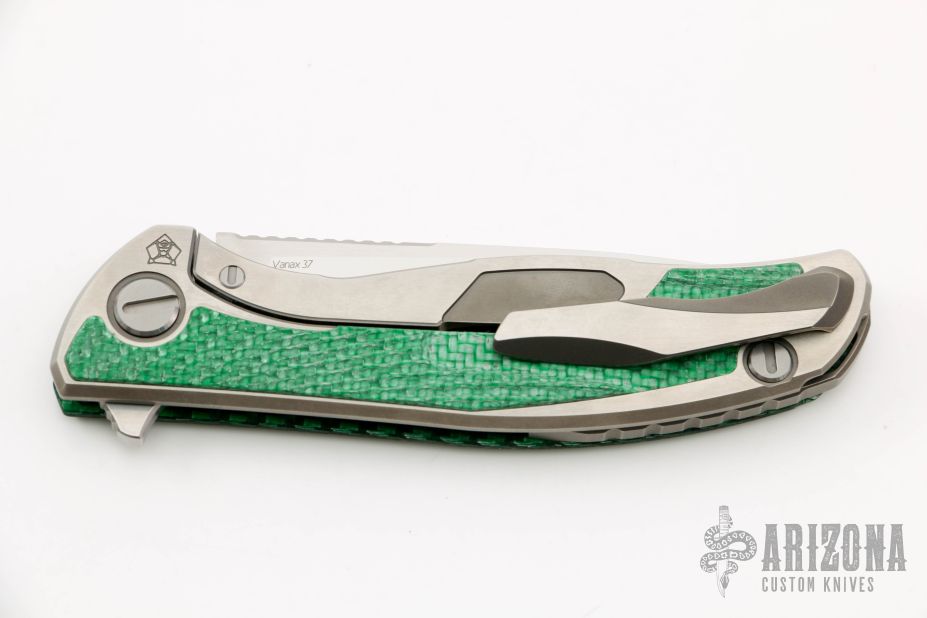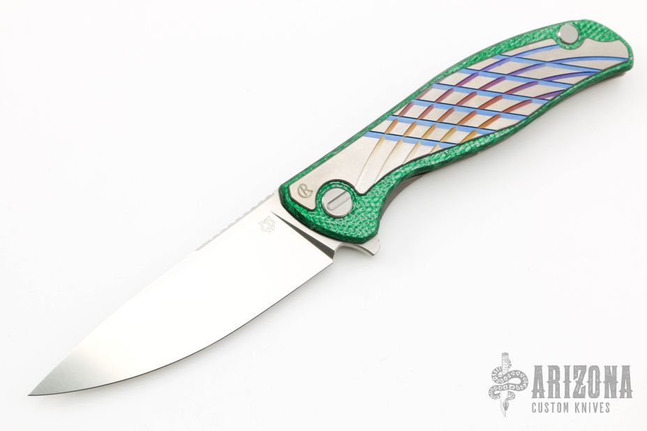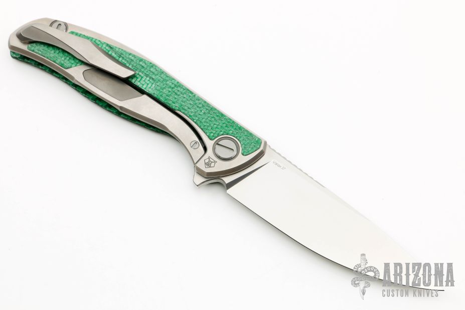 This knife is a collaboration between Shirogorov and Chris Reeve Knives, it features a tumbled blade with satin finished flats, notched thumbrest and flipper. The handle has green twill front scale with a titanium overlay with a unique graphic, titanium lockside with green twill inlay, tip up titanium clip with hidden screws, titanium backspacer. Comes with original box and papers. This knife is one of 10. From the 2019 USN Gathering.  Excellent Condition.