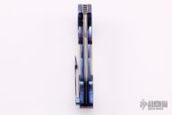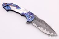 This gorgeous Archangel from Mr. Fischer features a Damascus clad San Mai blade with false top edge and flipper. The handle has a mokuti frame, mother-of-pearl scales, notched Titanium backspacer, and a tip up Mokuti clip. There are no visible screws on this knife except for the pivot. Blade is centered when closed and locks up with no play. Nice crisp detent. Very smooth action thanks to Mr. Fischer's bearing system. Includes a padded zippered case.  Excellent Condition.