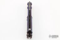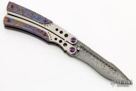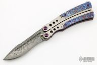 This Lepid Balisong by Patrick Famin features a harpoon style recurved Damasteel blade with swedge. The handle is comprised of a two-tone anodized titanium frame with jeweled interior and Zircuti overlays, anodized titanium barrel spacers. Ball latch on pommel. Includes a padded zippered case.  Excellent condition.
